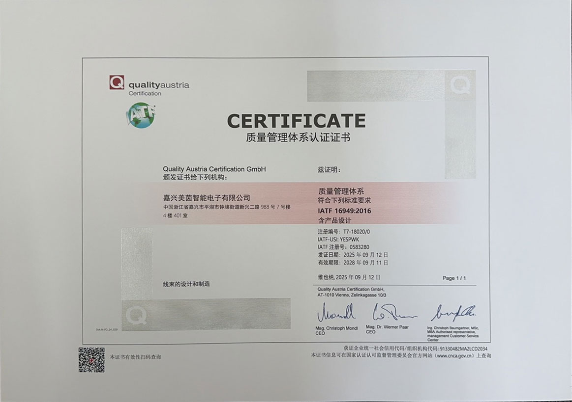 嘉兴美茵智能电子有限公司获得16949认证证书